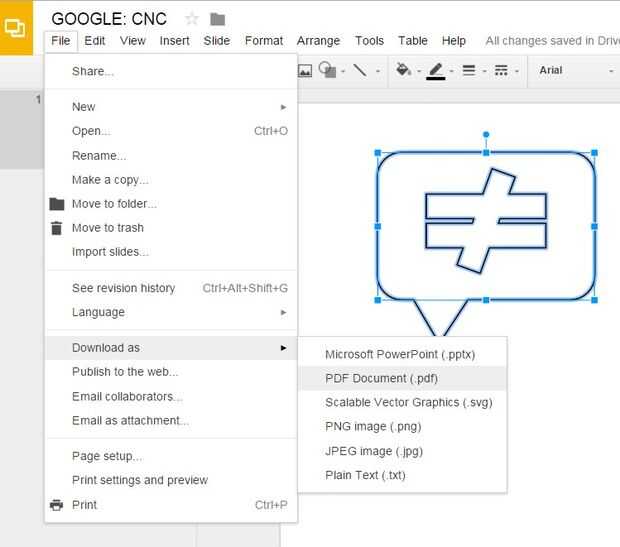 2.o dibujo reeeeeaaaaally fácil de hacer: abre tu cuenta de gMail, ir a la disco y crear una presentación nueva. Desde aquí es realmente fácil crear dibujos vectoriales que son convenientes para lasercutting, vinylcutting y fresado CNC incluso! Feliz