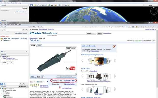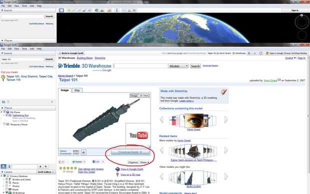 4) Descargar el modelo (.skp). Pasa a ser en este caso, el Taipei 101 modelo utilizado en la tierra no es descargable pero una búsqueda rápida de 3D Warehouse rindió algunos modelos grandes que son. Se puede saber cuáles son o no son por el azul desplegable "descargar modelo". Siempre puede usar Galería 3D sin pasar primero por tierra, pero no es divertido, generalmente. Otros modelos en otros formatos se pueden encontrar en Thingiverse (ideal para archivos .stl) y en Autodesk de 123D.