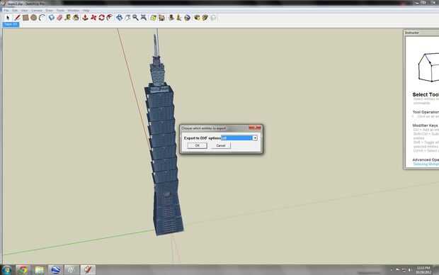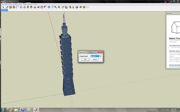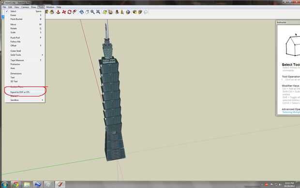 3) exportar como un archivo .stl. Selecciona todo el modelo y luego ir a que herramientas--> Exportar como DXF o STL. Guardar como unidades no es crucial a menos que su servicio de impresión 3d o software no tiene una opción de escala. Asegúrese de que sean coherentes. He tenido un montón de gente quiere varios edificios en la misma escala, y esto es donde puede importa esto. REP G tiene un mm a la escala de pulgadas, pero en este caso, esto es más práctico. Este modelo es probablemente en metros o pies. Yo no se preocupan por la escala en relación con otra cosa que, por lo que estoy recogiendo metros. Guardar como .stl.