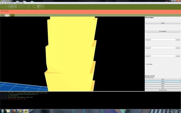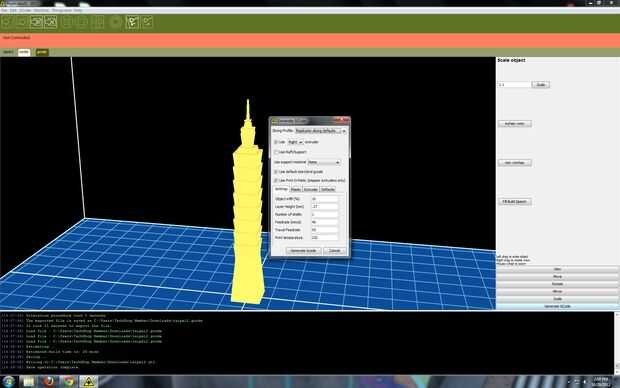 4) generar el código G. Utilizar el valor predeterminado para la mayoría de mis edificios. Algunos hacen bastante mejor con la altura de la capa de .1mm. 3 cáscaras también es una buena idea de cuando tienes estructuras finas... en este caso, por defecto está muy bien. Una vez hecho el G-Code, es hora de estimarlo. G-Code--> estimación. Esto le da una pista si tienes algo bueno pasando. Demasiado larga y su .stl puede ser que necesite algo más de trabajo en Sketch-Up. Demasiado corto y... nunca ha sido demasiado corto para mí así que no sé qué hacer. Satisfecho, haga clic en el código G ficha y cambiar la temperatura de la placa de compilación de C 110 a 115C (Figura 4-4). Procedimiento operativo estándar. Guardar el .s3g y prepárate imprimir.
