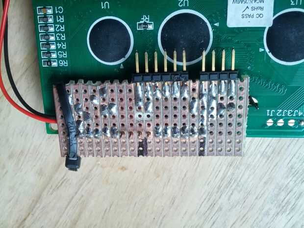 En el módulo de LCD que soldado en un pequeño desglose tablero qué herramienta de 6 y 4 cables de cinta de pin que vino de la placa principal y había conectado a los pines apropiados en el LCD 16 pin header.