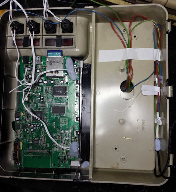 El circuito de joypad despojado fue conectado a los botones y con cinta en su lugar, y los cables ruteados tan ordenado como sea posible alrededor de la caja.