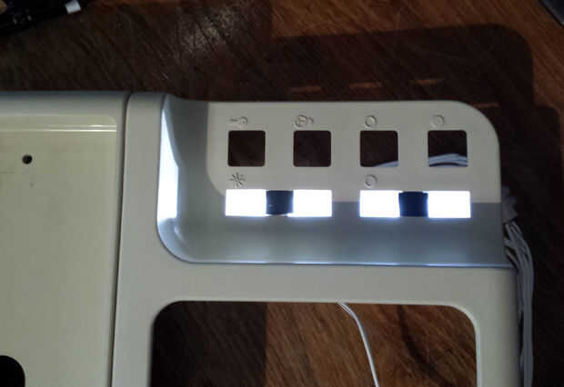 Por debajo de los orificios de botón eran hendiduras para los viejo deslizadores de volumen y contraste, que partí en dos usando a espaciadores de plástico, dejando huecos por debajo de cada botón. Yo Entonces superglued de plástico transparente a través de los agujeros y los iconos impresos a creé en el PC para indicar la función del botón arriba. Los iconos son retroiluminados por LEDs 5v blanco montado en una pieza en forma de u de conducto y alimentado desde el puerto USB del marco