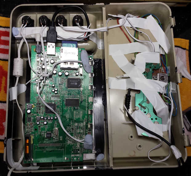 Con todos los bits en el caso de los alambres de finales fueron soldados juntos y arreglados para arriba con cinta de electricista. La tapa trasera cubre Afortunadamente el desastre!