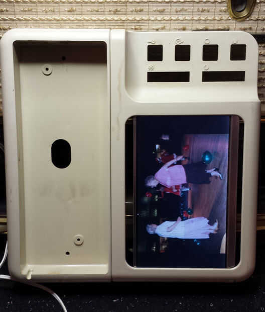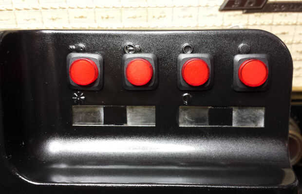 El marco era hotglued en lugar, usando un plástico envolvente desde otro marco de fotos desmontada para llenar los huecos a cada lado. Encontré los botones rojos grandes en la tienda Maplin, que provechoso es necesario un recorte de 15mm, el mismo tamaño que los agujeros existentes en el caso.
