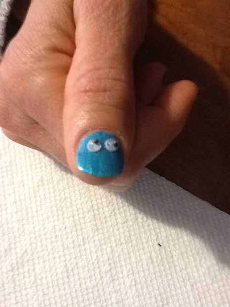 Pintar una capa superior de esmalte de uñas en la parte plana de los ojos saltones y pégalos en tus uñas.