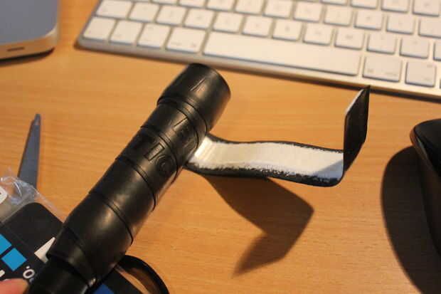 compré una empuñadura de raqueta de tenis para una tienda de deportes (deportes directo para ser precisos) por £2. Yo entonces lo envolvió hasta la base del poste a una longitud cómoda y entonces envuelto por encima de la empuñadura para dar un mayor agarre y para que sea esponjosa para reducir la vibración cuando la filmación.