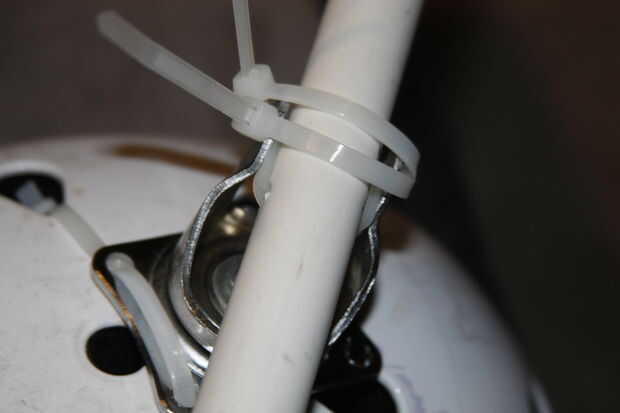 Alimentación dos zip lazos a través del agujero en la rueda para el eje y luego a través del orificio perforado en la tubería y por el otro agujero para el eje, apriete hasta el tope