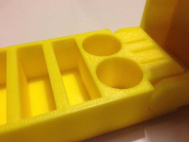 Entonces, había espacio sobrante para algo pequeño entre las bisagras. Como no tuve baterías que cabrían en el espacio, dibujé en tres ranuras para mini SDs. Dejar caer las cosas mucho, así que les hice un ajuste apretado. Impreso varias ranuras del tamaño de la prueba y me fui con la mejor de mi impresora. Mi impresora solía ser un Makerbot, pero puesto que cada pedacito de plástico ha sido sustituido por el aluminio del billete, el caso re-hecho para operación libre de vibraciones y la cama, única pieza de aluminio de Makerbot, cambiada a cristal, no creo que ya es un Makerbot. Ciertamente no imprimir como uno, así que no puedo predecir qué ranuras de tamaño la impresora producirá.