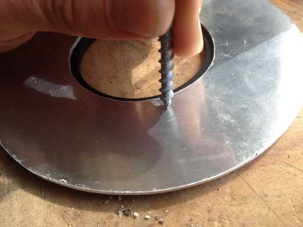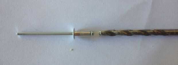 Hacer el los agujeros un poco más grandes que la cabeza del remache (ver foto), no demasiado grande, de lo contrario podría tirar a través. Brocas pequeñas tienden a bailar alrededor de taladrar metal, así hacerlo se comportan, que un martillo y un objeto punzante duro (clavo/tornillo) y pulse un agujero guía en cada una de las 5 cruces marcado hacia fuera.