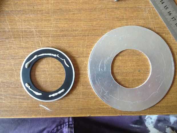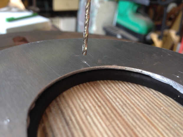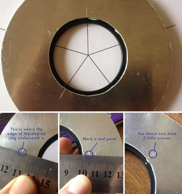 Gire el anillo y mida la distancia desde el interior del paso anillo al exterior del escalón hasta el anillo. Gire el conjunto otra vez y para rayar un poco marca donde el borde del paso anillo estaría por debajo de esta medida. Sólo necesita hacer esto una vez. Mida la distancia desde el interior de la dona a esta nueva marca y divide por 2 (tengo 5mm), entonces utiliza esta medida para rayar una cruz sobre las 5 líneas que antes. Esto es donde usted quiere perforar. (véase el cuadro 4 para detalles)