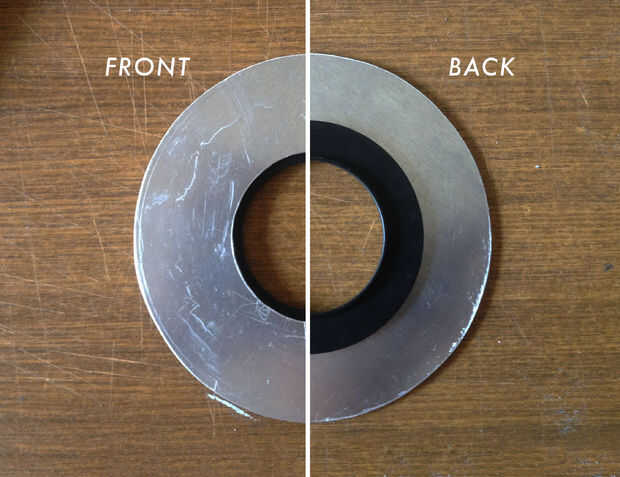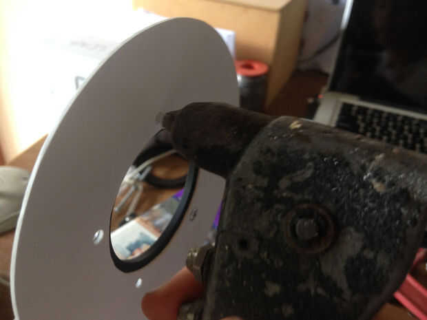 Una vez que la pintura esté seca, usted puede asegurar los dos anillos juntos. Asegúrese de alinear los agujeros mientras que se perforaron porque a menos que estés loco exacto, los 5 agujeros le perforó probablemente no están perfectamente separadas, y realmente le chupa si tiró un remache a través sólo para que todos los otros agujeros desalineados. Empezar por meter un remache a través de ambas partes para que la cabeza sobresale de la parte posterior. Luego coloque una arandela pequeña en la cabeza, extender los brazos de la pistola de remache, inserte el extremo largo y fino del remache en la pistola de remache en cuanto puede y apriete la manija. Si el remache no tire todo el camino a través, vuelva a abrir los brazos de la pistola de remache, empuje el resto del remache en la pistola y apriete otra vez.