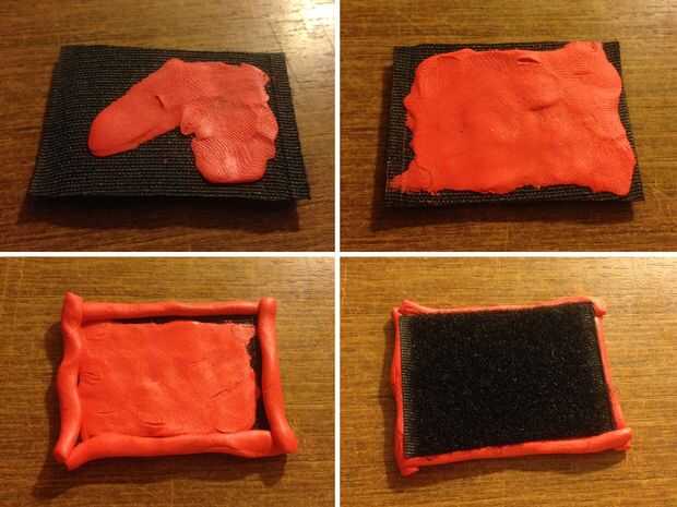 Comienza cortando un rectángulo pequeño de velcro, lo suficiente como para cubrir una buena sección de la parte posterior de la caja de GoPro. Tome un paquete de 5 gramos de Sugru y tomar lo suficiente como para hacer una serpiente de 2mm ancho que recorre el perímetro del velcro, lugar este aparte. Presione el resto de la Sugru en la parte posterior del velcro para hacer una capa delgada (que tenga un poco de Sugru sobrado). Me pareció la mejor manera de hacer esto aplicarlo en pequeñas bolas y 'manchar' en las fibras del material. Continuar hasta la Sugru llega casi hasta los bordes.
