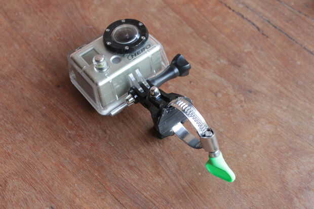 Se me ocurrió la solución sencilla de utilizar una abrazadera de la manguera como el dispositivo de fijación como esto permitiría el montaje para ajustarse a cualquier forma o perfil tubo/barra mientras aún aplicando suficiente fuerza. Para acomodar para los diámetros más grandes o más pequeñas de tubo todo lo que necesitas hacer es conseguir una abrazadera más grande o más pequeño!