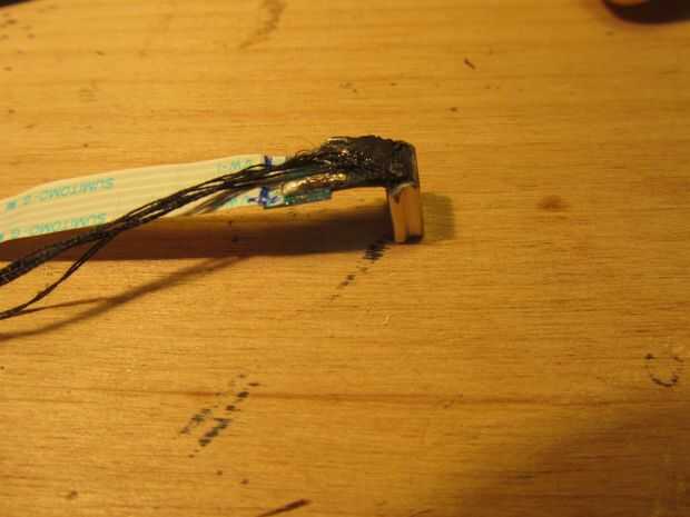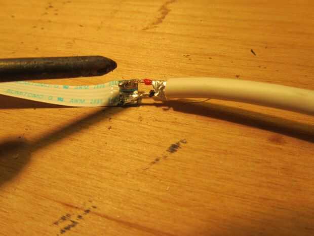 Calentar el soldador y empezar a soldar los pines de dos para el cable de cinta. No haga que la Junta de soldadura demasiado grande porque desea que el conector para encajar en su marco. Soldar el cable al conector USB de cinta y cinta eléctrica para la conexión. Ahora agregue un trozo pequeño de cuerda y pegamento estupendo para el mini conector USB para una fácil extracción.