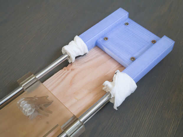 Para suavizar el aterrizaje, envuelve los tejidos alrededor de la parte inferior de las barras. Esto ayuda a reducir la cámara rebotando hacia arriba después de que aterrice. Es una solución aceptable, pero hay todavía un poco de un meneo cuando la cámara llega a la parte inferior. Esto es donde yo voy a seguir trabajando en él para futuras versiones, pero por ahora el material está saliendo bastante bien para tiros más. La leve ondulación en el aterrizaje ayuda a acentuar el impacto, pero no es el mejor.