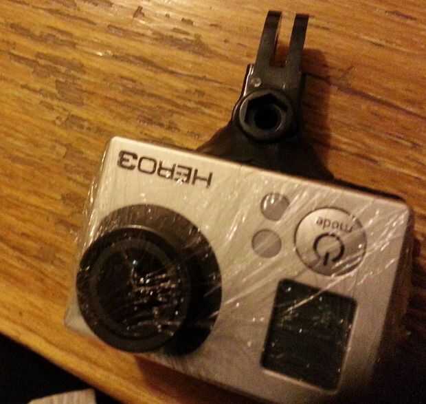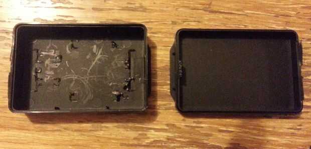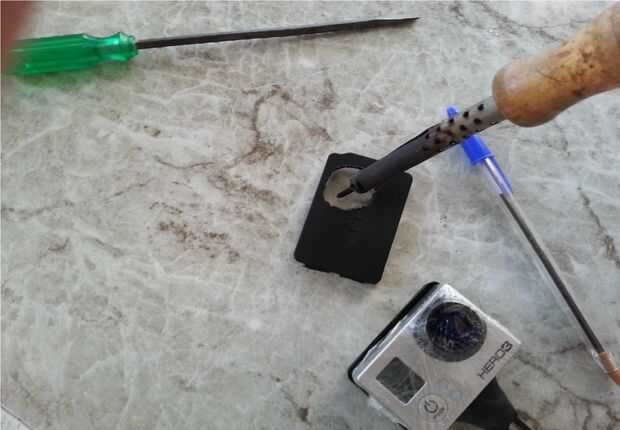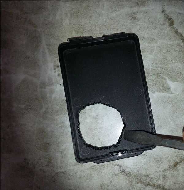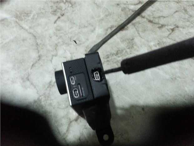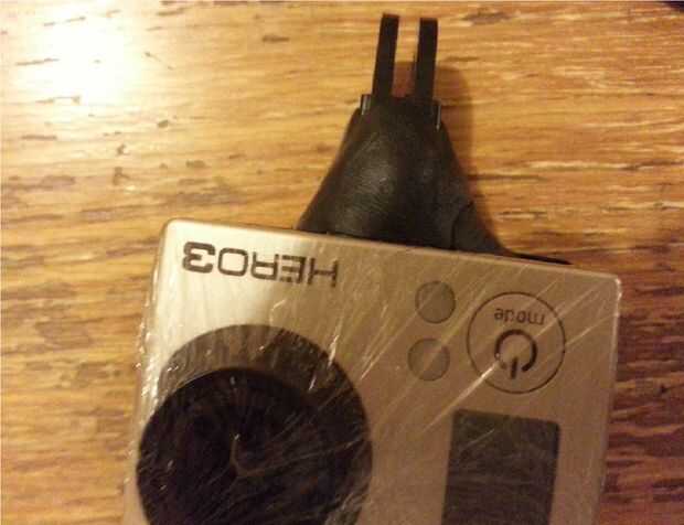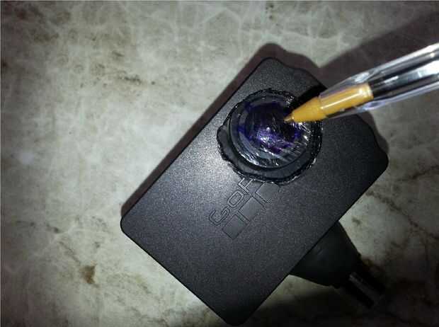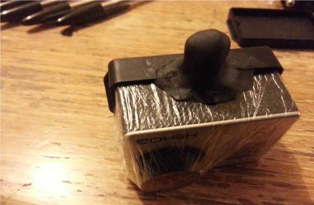 limpiamos primero el caso de las pequeñas protuberancias dentro, separado los dos casos. Luego envuelve la GoPro Hero3 Cam con un Naylon para garantizar que no se pega el Sugru, luego moldeamos 1 bolso (5 g) de Sugru en cilindros pequeños y ponerlo en el GoPro mientras está en la cubierta trasera caso, entonces nos Retire la tuerca de metal pequeño de un conjunto pequeño y luego ponemos encima el sugru y moldearla. Luego envuelve en otro paquete de Sugru. Luego guardarlo por un día hasta que se firme. Usar el metal caliente y hierro que wholeswhere el lente sale (uso de pen a su manera de la marca) y donde desea que la fuente de alimentación, hdmi y micrófono para entrar en el marco, por último utilizar un par de gomas elásticas para mantener unida a la estructura.
