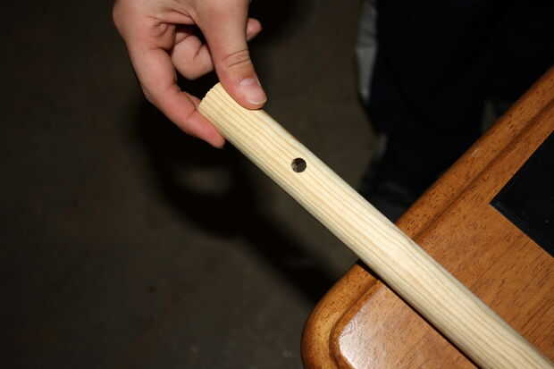 Taladrar un agujero cerca del extremo de la espiga usando una broca de 5/16 de pulgada. Medir 2,75 pulgadas hacia abajo y perfore otro agujero. Durante la perforación a través de la clavija, asegúrese de tomar su tiempo y no se aplican a mucha presión para un agujero limpio exacto.