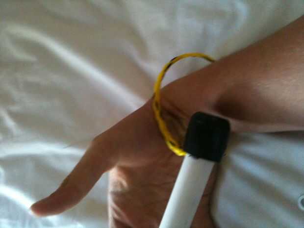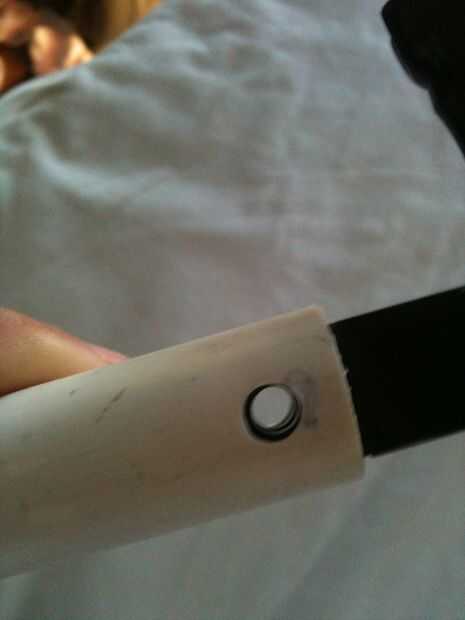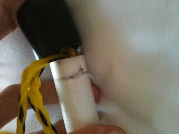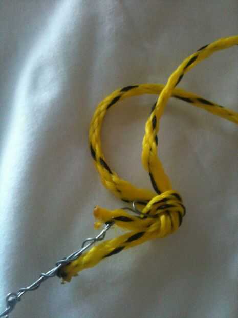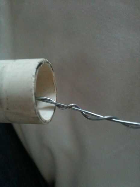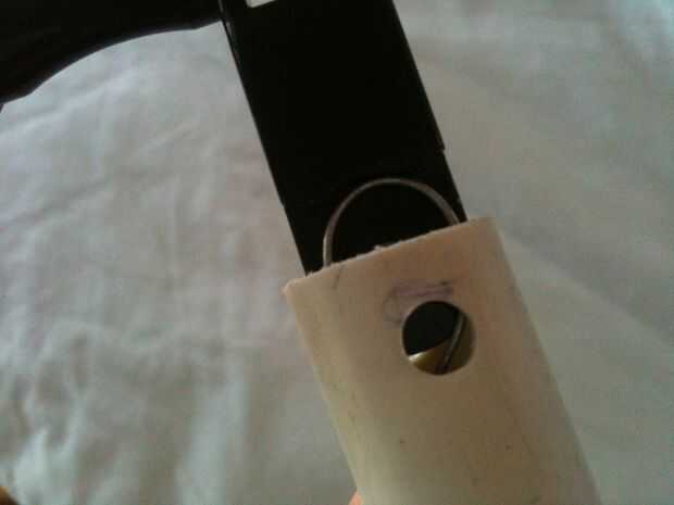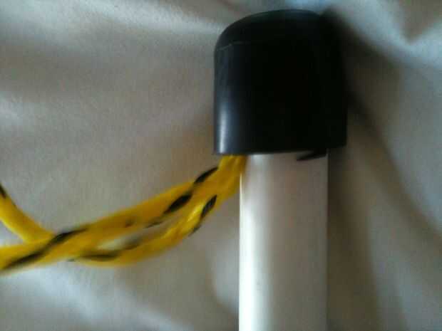 Como una soga de seguridad utiliza un cable con dos lazos a cada lado. Colóquelo dentro del pvc. Un lazo está rodeando el perno, al otro lado está atado con una cuerda que puede contener alrededor de su muñeca. Importa si el cable es un poco demasiado largo para el poste, el brazo de pivote va a empujar el cable si se empuje hacia atrás otra vez. Coloque la tapa en. El polo ya está terminado