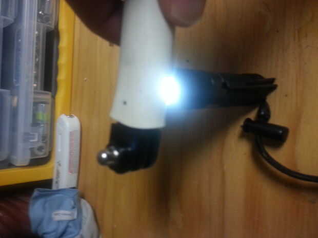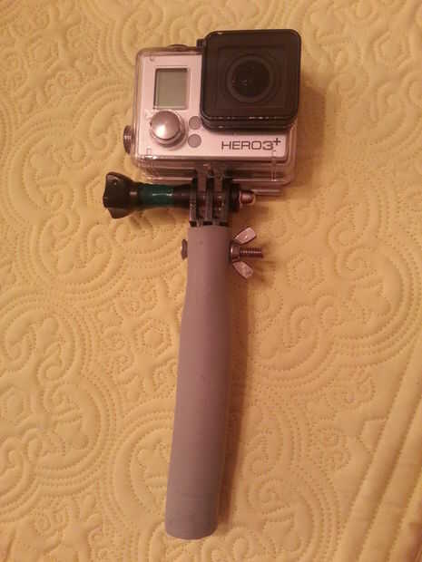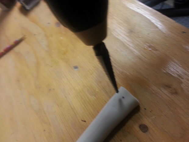 Usted podría adivinar donde va el agujero, pero no tenemos que. Para perforar un agujero perfecto, entra en una habitación oscura, brillar una linterna brillante a través de la PVC mientras se introduce la bisagra de GoPro. Pude ver un débil círculo de luz. Marque el centro con un lápiz en ambos lados. Retire la bisagra de GoPro. Toque la marca de lápiz con un punzón para hacer mella, y luego perfore con la broca escalonada hasta que aceptará el perno métrico. Inserte la bisagra, inserte el perno, que pueden necesitar para enroscar en lugar usando el destornillador y el tornillo en la tuerca de mariposa.