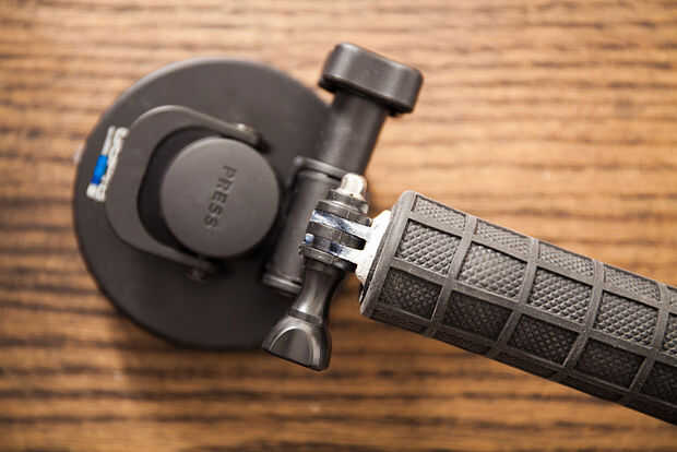 Conecte la cámara y el poste en el montaje de succión de GoPro. No se olvide de la tarjeta de memoria - es muy importante... confía en mí en eso.