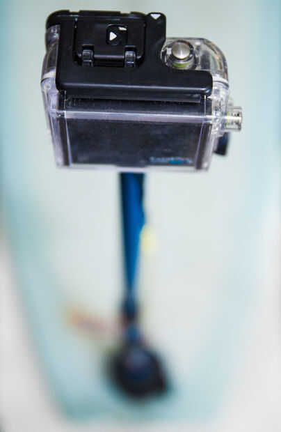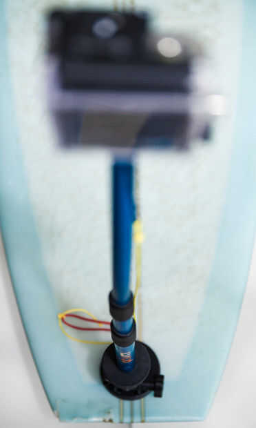 Monte la cámara en la parte trasera de la tabla presionando firmemente hacia abajo el botón central y bloquear el brazo. Asegúrese de que la superficie esté libre de cera, arena, polvo o suciedad (ignore el ding en la parte posterior de mi Junta - surf ha sido grande y perdí en las rocas el otro día).