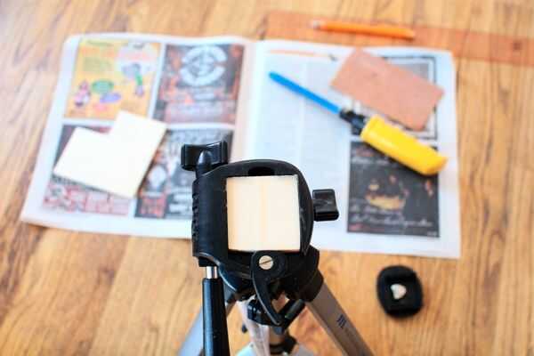 Utilizando como referencia la placa extraíble, cortar un trozo de madera para caber dentro de la parte superior de su trípode. Empecé con una pieza de madera cortada al tamaño exacto como la parte inferior de la montura de la placa y terminó encima de lo lijado un poco para obtener sólo el ajuste correcto.