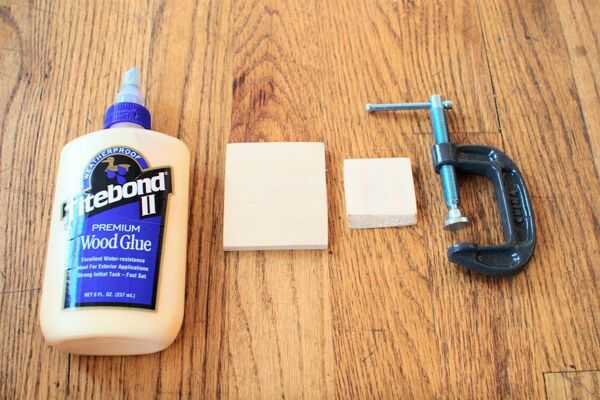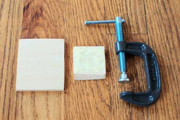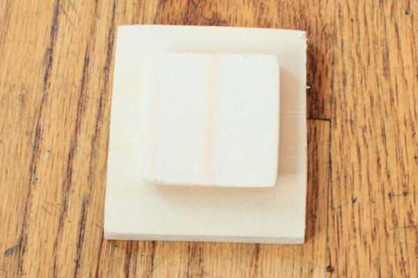 Usando un poco de pegamento para madera, coloque la pieza más pequeña de madera a la pieza mayor recién cortada. Preste atención a la orientación del bloque parte inferior recortada cuando se encole en su lugar. Sujete la pieza juntos hasta que el pegamento ha fijado.
