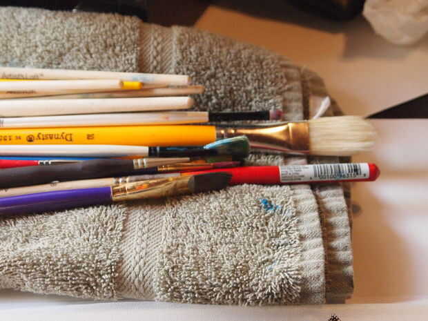 - Agua, recipiente para la limpieza de los cepillos, la toalla de papel o toalla de mano