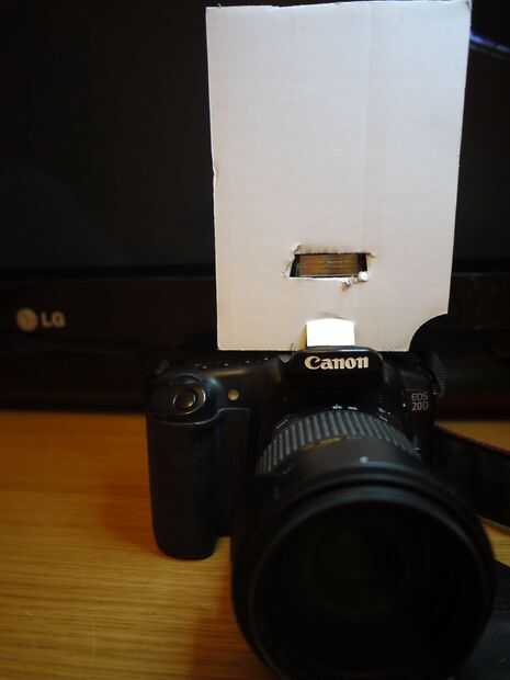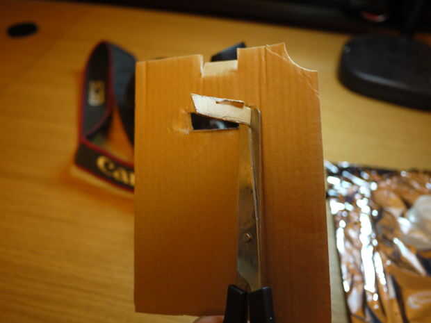 Ahora tenemos que hacer un orificio para el flash. En la cartulina marca una zona que está cubriendo un flash y cortarlo. Mejor utilizar un cuchillo de corte-hacia fuera. Tijeras son también aceptables, pero no tan exacta. Colocar un cartón en el borde y ver si el agujero es aceptable. De lo contrario, ampliarlo.