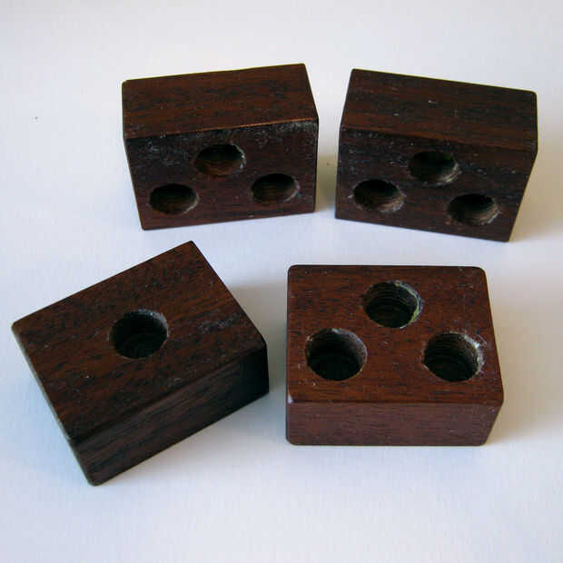 Estos bloques son caoba (madera blanda) con dimensiones 2 7/8 "x 1 3/8" x 7/8 "(2,875" x 1,375" x. 875"). Los agujeros iniciales fueron perforados con un 31/64" bits (probablemente 1/2" estaría bien, pero usé lo que tenía). Eran tres atractivo espaciados por un lado y uno en el otro. Luego se rosca con un 1/4" NPT tap. ¡ Sí! Rosca madera suave con un hilo de rosca de pipa! Los hilos de rosca se solidifican y agujeros muy ligeramente ampliaron poniendo un conector.