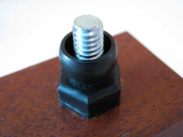El perno es un tornillo de 3/4" 1/4-20, el tamaño estándar para un montaje de cámara. Tuve que moler abajo de las cabezas de los pernos para que le caben los conectores. Ellos se pegan (con pegamento caliente que probablemente no es lo ideal). Mientras se ponía el pegamento, rosca una tuerca simple (no mostrada) en el extremo que sobresale para establecer una extensión uniforme.