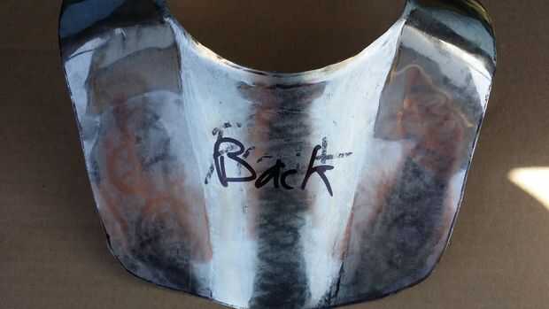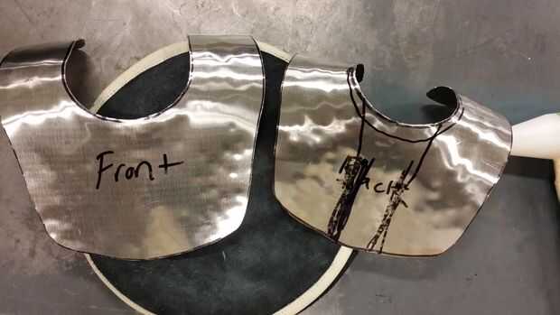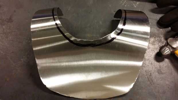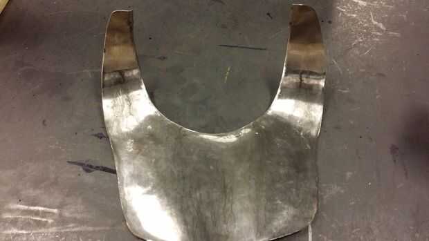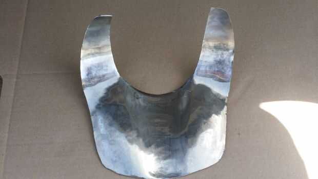 Voltea la pieza y un martillo un plato poco profundo a cada lado del canal, concaving en la dirección opuesta de la depresión. Esto presionará contra los músculos pectorales aumentar aún más la placa el esternón y los huesos del cuello y aprovechando el amortiguador natural del tejido muscular. Si nos fijamos en la placa de la parte inferior, el borde tiene forma de S poco profunda.