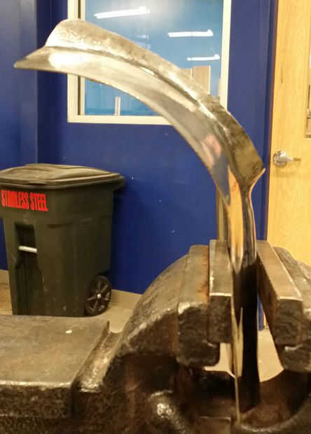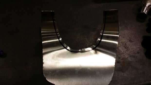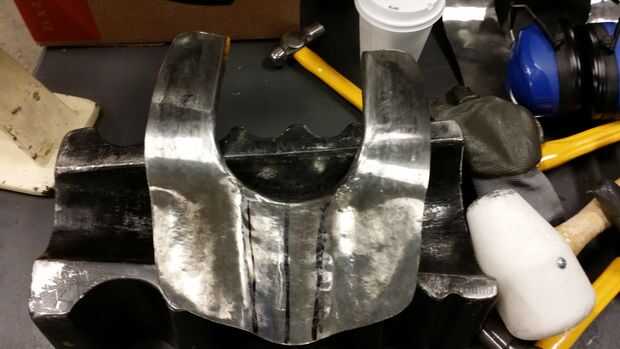 Aplane cada pieza para alisar hacia fuera. Martillo endurecer toda la pieza para darle la rigidez que necesita para parar golpes de conseguir a través. Aplanador y endurecimiento de martillo fue complicado porque tendía a sobre exagerar las curvas estaba tratando de lograr. Pude conseguir lo que quería, pero la próxima vez ahorrar tiempo e ir con 410 acero inoxidable luego endurecen + genio en un horno o forja.