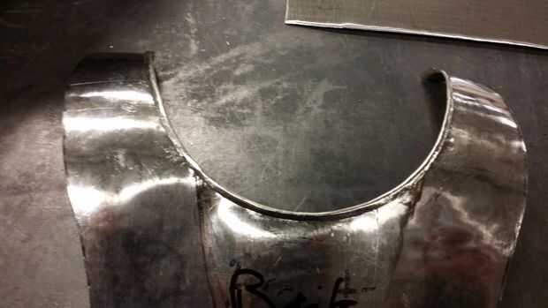 Por último, se encrespan las secciones de la parte superior del hombro en un semicírculo. Que desea moldear en dos direcciones, recto para hacer una forma de C, pero también un poco para que se amolde a la forma de su músculo del hombro cóncavo. Había doblada la forma de C con la mano sobre mi muslo, luego utiliza la rueda inglesa y Martillo aplanador neumático para crear la concavidad leve y endurecer la pieza.