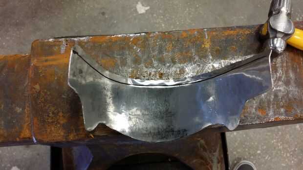 Martillo de endurecer las lames era realmente complicado porque el Martillo aplanador neumático tenía acceso a sólo tiene un cóncavo martillo y yunque, aplanando tendía a deformar y distorsionar la forma estaba tratando de lograr. Esta es una situación donde utilizando acero inoxidable 410 luego endurecer en una fragua u horno realmente pagaría.