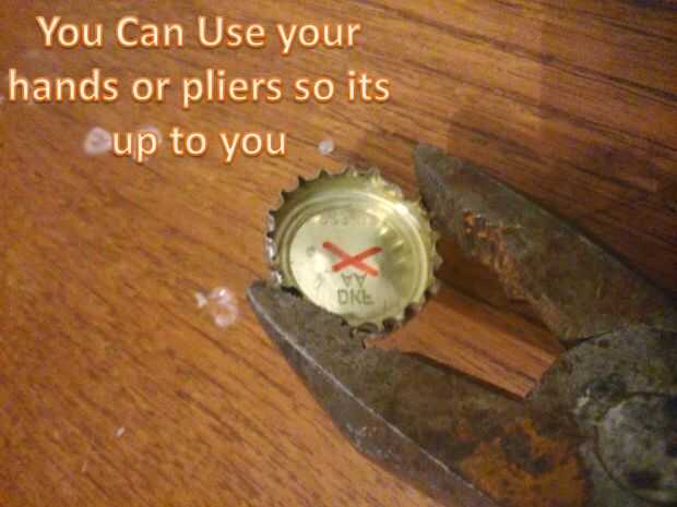 Luego Inicio presionando el círculo externo (la parte que agarra el labio de la botella) hacia adentro esto es la parte más incómoda porque necesita ser capaz de caber perfectamente dentro de la segunda sin modificaciones (una vez de la botella) tapa de la botella, debe crear una fricción a la segunda tapa pero antes de cerrar los dos en su lugar tienes que hacer el siguiente paso.