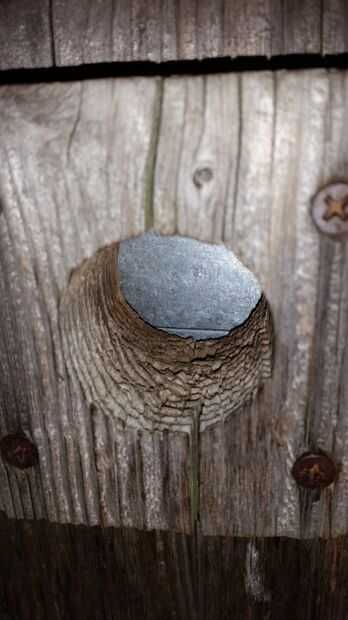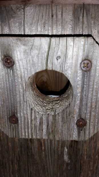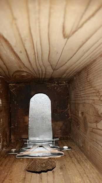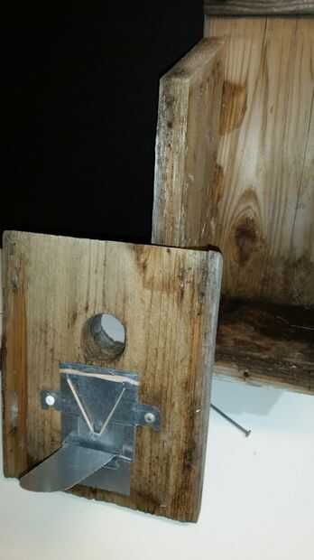 La trampa se une a un par de tornillos en el interior de la pared frontal de la casa del pájaro.