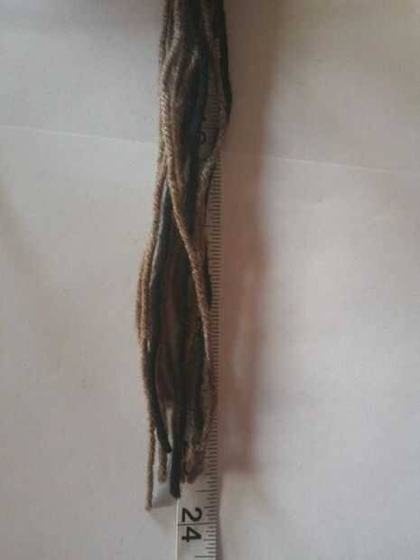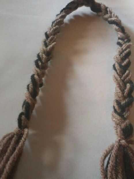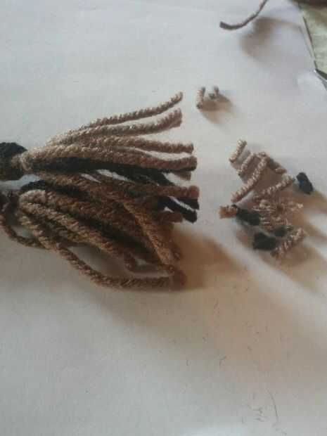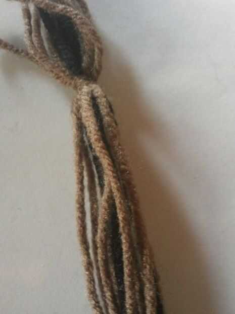 a. corte hacia fuera aproximadamente 9 filamentos de hilo de unos 23-24 pulgadas de largo. b. atar los extremos con un pequeño filamento de hilo c. los hilos de la trenza d. atar el extremo de la trenza e. doble la trenza por la mitad y corte los extremos de los hilos para que puedan ser filamentos iguales