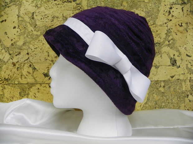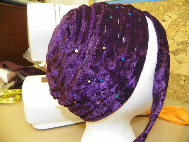 Encontré un vestido de terciopelo larga en la tienda, creo que había suficiente tela de ese vestido para hacer 2 sombreros! En lugar de agregar un borde, sólo continuó formar las tiras alrededor y agrandando un poco a la vez, hasta que fue el tamaño que quería. Para hacer el forro de este sombrero, hacer lo mismo con la tela de la guarnición, cortar en tiras, cose en una puntada de moda y de la mano de espiral dentro del sombrero. Esto le dará un poco más de estabilidad y calidez.
