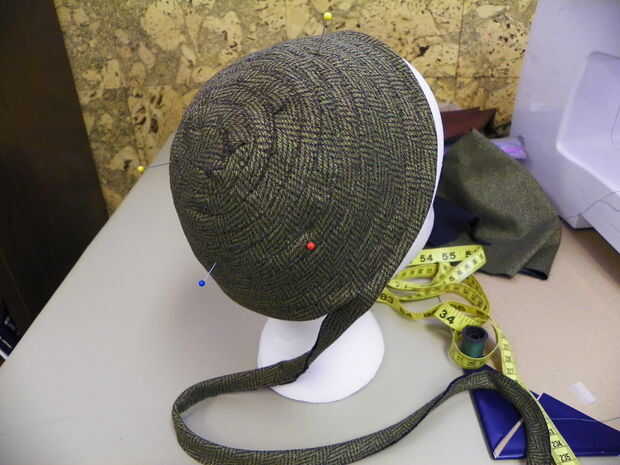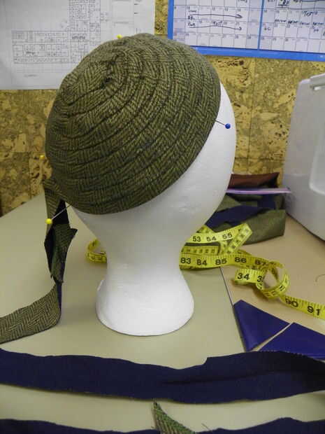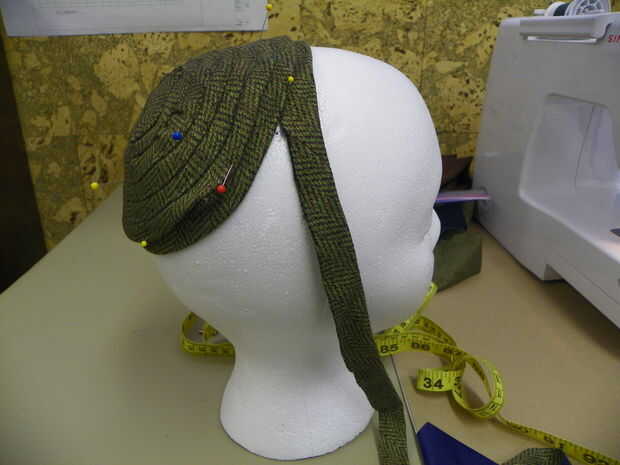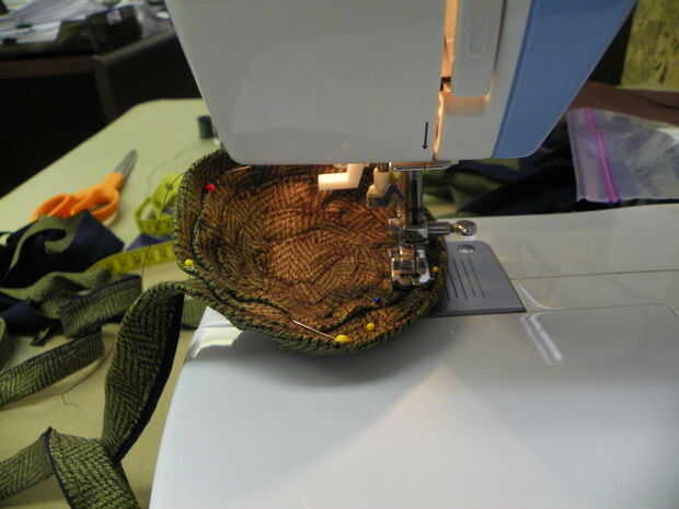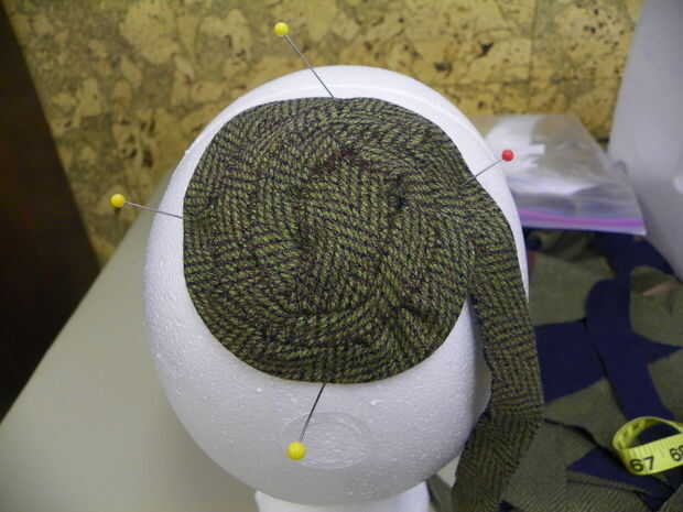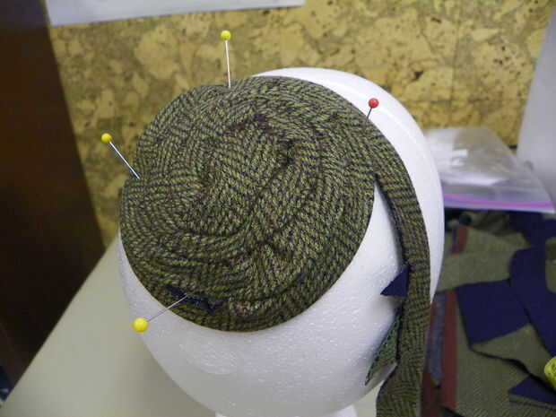 a partir de la corona será un poco frustrante, pero solo hay que meterse con él y reorganizar hasta hace lo que quiere. Debajo de los bordes y convirtiendo la tira en un círculo. Una pequeña sección del perno, cosa abajo, pin que algunas cosen más, más, etc.... evitar colocarlo en la cabeza de espuma de poliestireno, de vez en cuando, asegurándose de que se está formando en la forma correcta. sigue trabajando alrededor en forma circular hasta que llegue a la parte posterior del sombrero de la parte superior del cuello. meta el extremo de la tira por debajo y tack en el lugar.