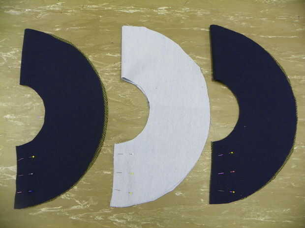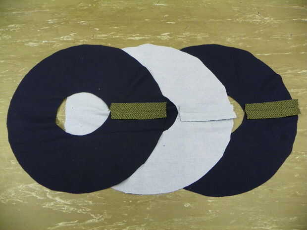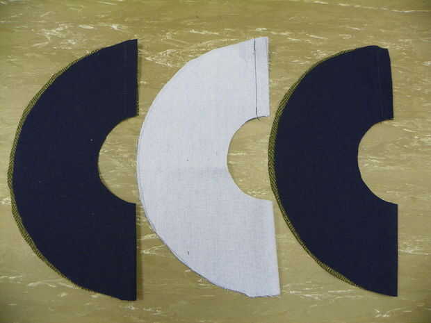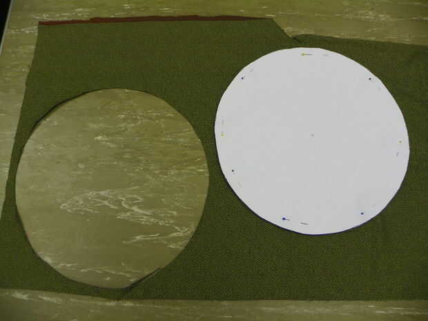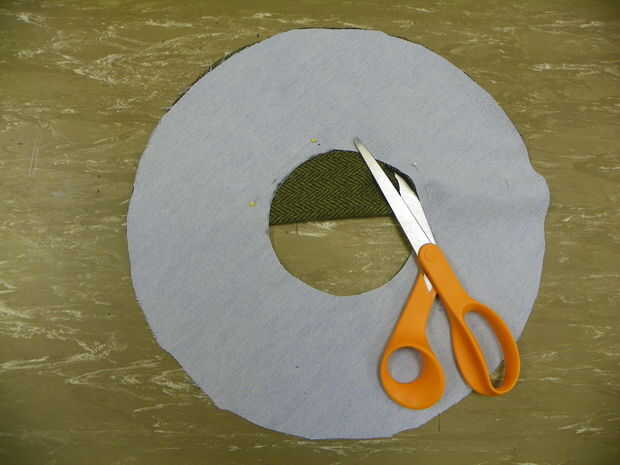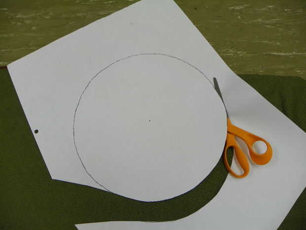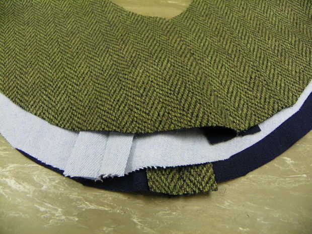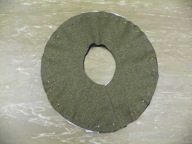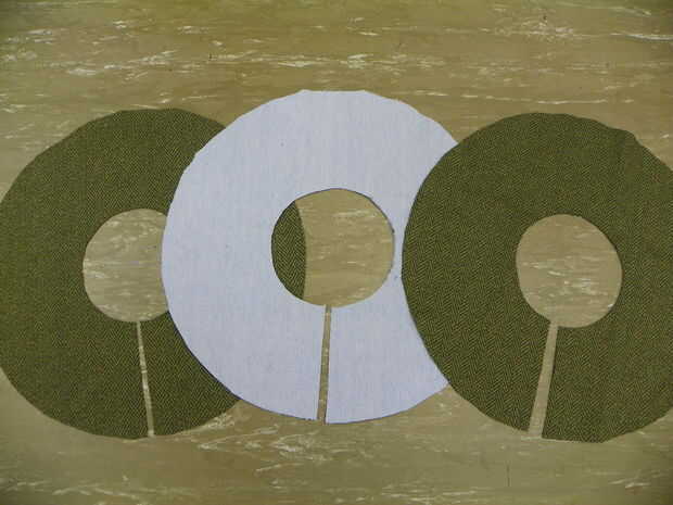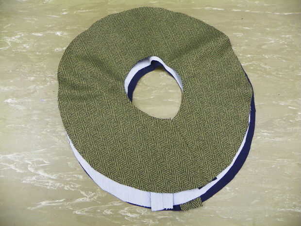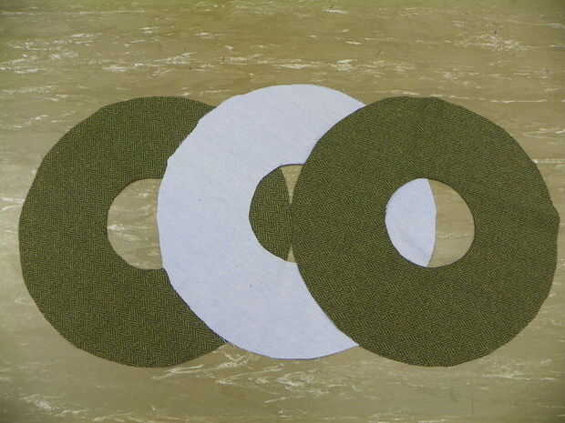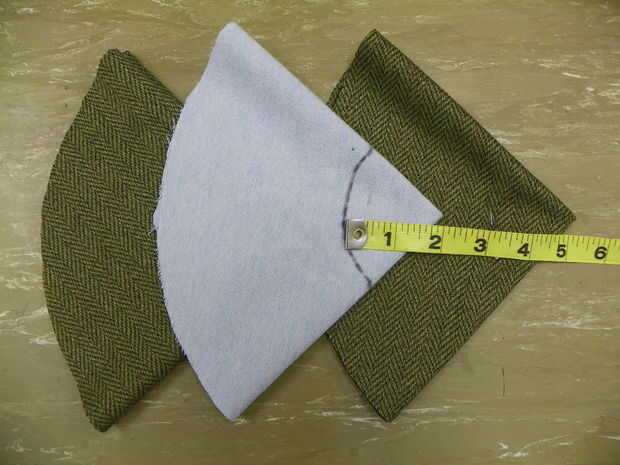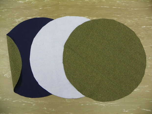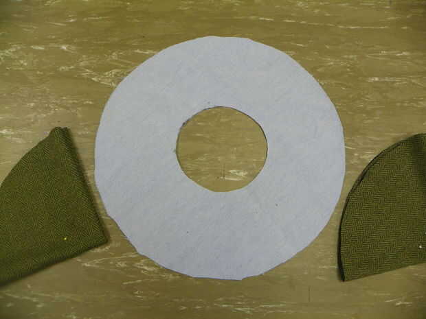 cut a 12" circle out of paper for the pattern. Usando el patrón, cortar 2 círculos de la tela y 1 de Dril ligero o entretela pesada. doblar la interfaz por la mitad y luego por la mitad otra vez. usando la cinta métrica, mida 2" desde el punto de, marque con un lápiz. Corte en la línea. Este círculo se despliegan. Utilice como patrón para recortar los otros 2 círculos de tela. Hacer un corte en cada círculo de un lado a la mitad. Doble cada círculo por la mitad y coser la costura, aquí es donde se puede hacer el ala plana o cónica. Para un borde más afilado, hacen la costura más estrecha hacia el exterior del círculo. Abrir los círculos y plancharlos abiertos. Capa de los círculos en este orden: tela lado derecho abajo, entretela y, finalmente, derecho de la tela hacia arriba. Escalonadas las costuras un poco para que el bulto no era todo en un solo lugar. Prender juntos. utilizando la máquina de coser, coser todo alrededor a 1/4" o desde el borde. coser del revés tira juntos todo el borde. Doble puntada diagonal de tira y de la mano.