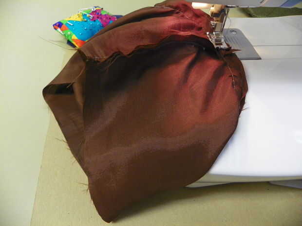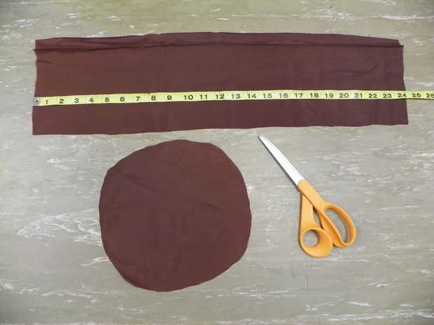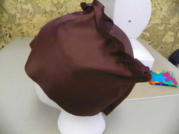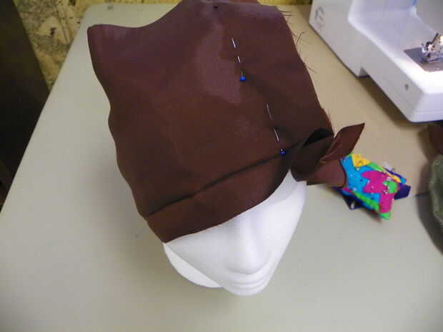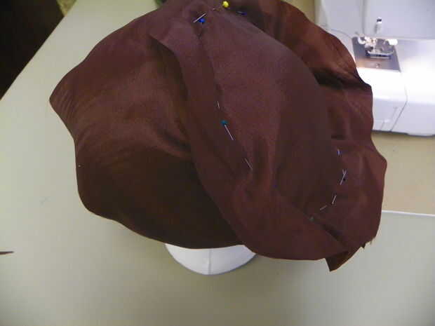 Con el forro de la falda, corte un pedazo 24 "x 8". coser los extremos cortos junto con margen de costura de 1/2". Cortar un círculo de 8" de diámetro. Coloque la sección larga en la cabeza de espuma de poliestireno. Ponga el círculo en la parte superior de la cabeza y los lados del revestimiento al círculo superior. Recorte el exceso. Quitar de la cabeza y coser alrededor. PIN dentro del sombrero y coser a mano.