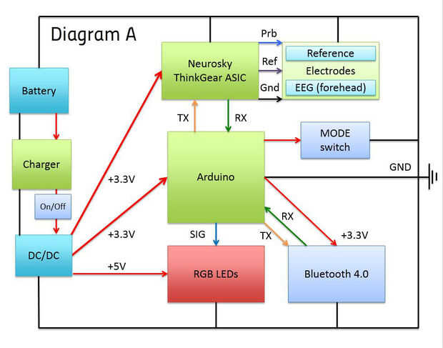 este es otro hack mente Flex, como mbmosher de Mindflex-Duel-Bluetooth-Arduino-FIO-Hack, pero incluye algunas características adicionales. El sistema está construido de un mini Arduino Bluetooth Bee-independiente , incluye un pre amplificada PulseSen