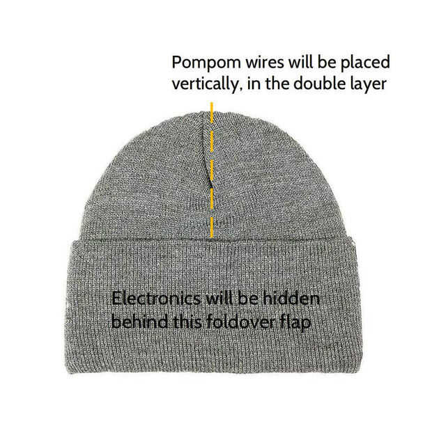 - 1 sombrero de doble capa con una aleta plegable ancho. No necesitas comprar el sombrero más caro: como tiene una aleta plegable amplia y lo más importante es una doble capa, que va a hacer. Se oculta toda la electrónica en la parte plegable. Los cables de pompón se ejecutará a través de la capa doble del sombrero.