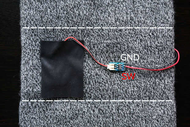 • Soldadura sobre dos cables: uno en el pin de "SW" y el otro en el pin "GND". Estos cables deben ser lo suficientemente largos para dar la vuelta al otro lado del sombrero. Posteriormente en el tutorial, se conectará los cables GND y SW (+) de Arduino.