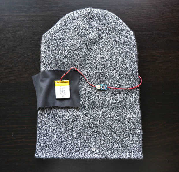• Coloque la batería por debajo de la doblez de la solapa del sombrero. Cortar un rectángulo de fieltro o microfibra, ligeramente más grande que la batería. Cosa, para hacer una bolsa para la batería.