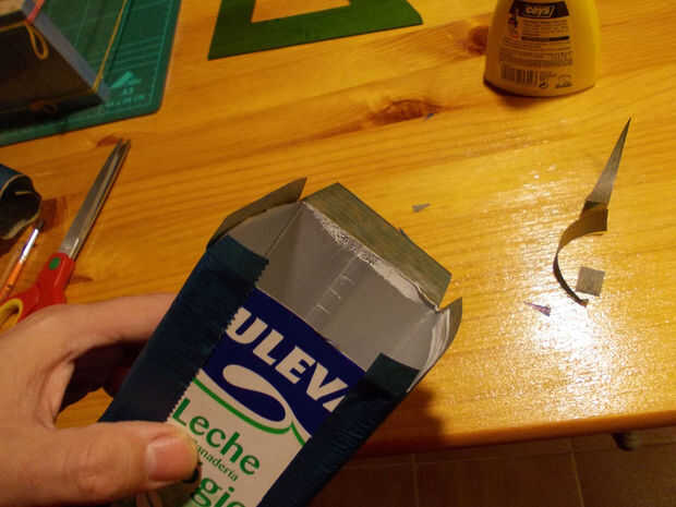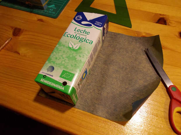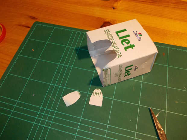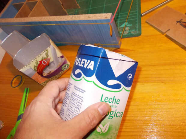 Una vez forrados estos cajones grandes, me dí cuenta que no tenía por donde tirar de ellos, así corté unas pestañas de otro cartón de leche, las forré y las pegué a estos cajones.