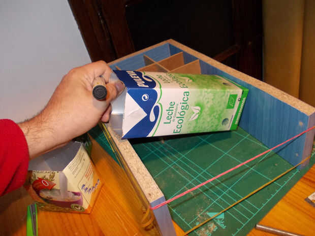 Después de tenga que ver en este cajón debe cortarse en diagonal para permitir abrir girándola. Para ver esto, colocar el cajón donde deben ir y marca la parte superior de espalda punto que contacto con la estructura de conglomerado. De dos o tres milímetros hacia abajo de este punto en la parte delantera superior de este cajón, hacer un corte diagonal para permitir la apertura.