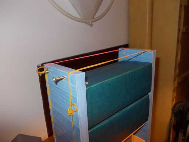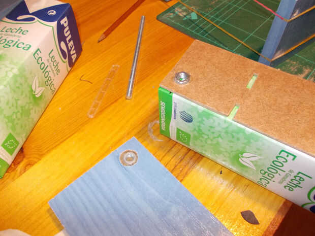 Antes de forrar los cajones grandes, los agujereé por donde van sujetos a la varilla roscada. Para esto, coloqué la parte de la estructura interna donde fijé la rosca, y exclusivamente donde va el agujero. Yo lo agujereé con una broca de madera pero se puede hacer con un cutter o similar.